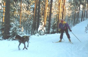– Pidä vetonaru aina tiukalla eli veto päällä; myös alamäissä. Jos koira juoksee alamäet hiljempaa, kuin mitä sukset luistavat, auraa suksilla ja kiristä vetonarua kädellä, jotta veto säilyy. Samalla varmistat sen, ettei naru sotkeudu koiran jalkoihin tai jää suksien alle. Älä laske alamäissä koirasi vierelle tai ohi, vaan pysy aina sen takana. Näin voit aina tarkkailla koiraasi. Varo etenkin laskemasta suksillasi koirasi päälle. Herkkä koira voi saada kammon jo yhdestä ikävästä kokemuksesta.