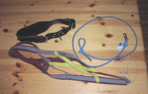 - joustava naru, jolla kytketään koira valjaista vetovyöhön, sopiva pituus n. 2-3 m