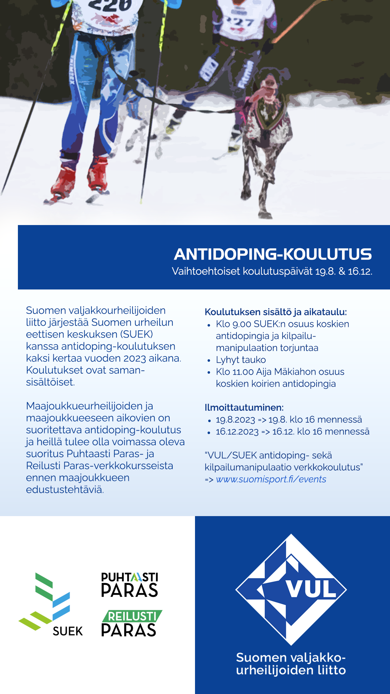 Liitto järjestää vuoden 2023 aikana kaksi antidoping-koulutusta, jotka on tarkoitettu ihan kaikille lajia harrastaville ja niiden käymistä suositellaan vahvasti kaikille. Maajoukkueurheilijoille koulutuksen käyminen on pakollinen ja lisäksi heidän tulee huolehtia että Puhtaasti Paras- ja Reilusti Paras -verkkokoulutukset ovat voimassa ennen maajoukkuetehtäviin osallistumista.