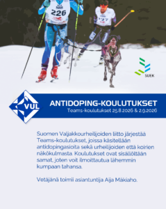 VUL järjestää jälleen kaksi antidoping-koulutusta syksyllä 2026 Koulutuspäivät ovat 25.8.. ja 2.9, klo 19-20.30 ja koulutus tapahtuu Teamsissa. Koulutukset ovat keskenään samansisältöisiä ja niissä käsitellään sekä ihmisten että koirien antidoping-asioita. Kouluttajana toimii Aija Mäkiaho ja ilmoittautuminen tapahtuu SuomiSportissa.