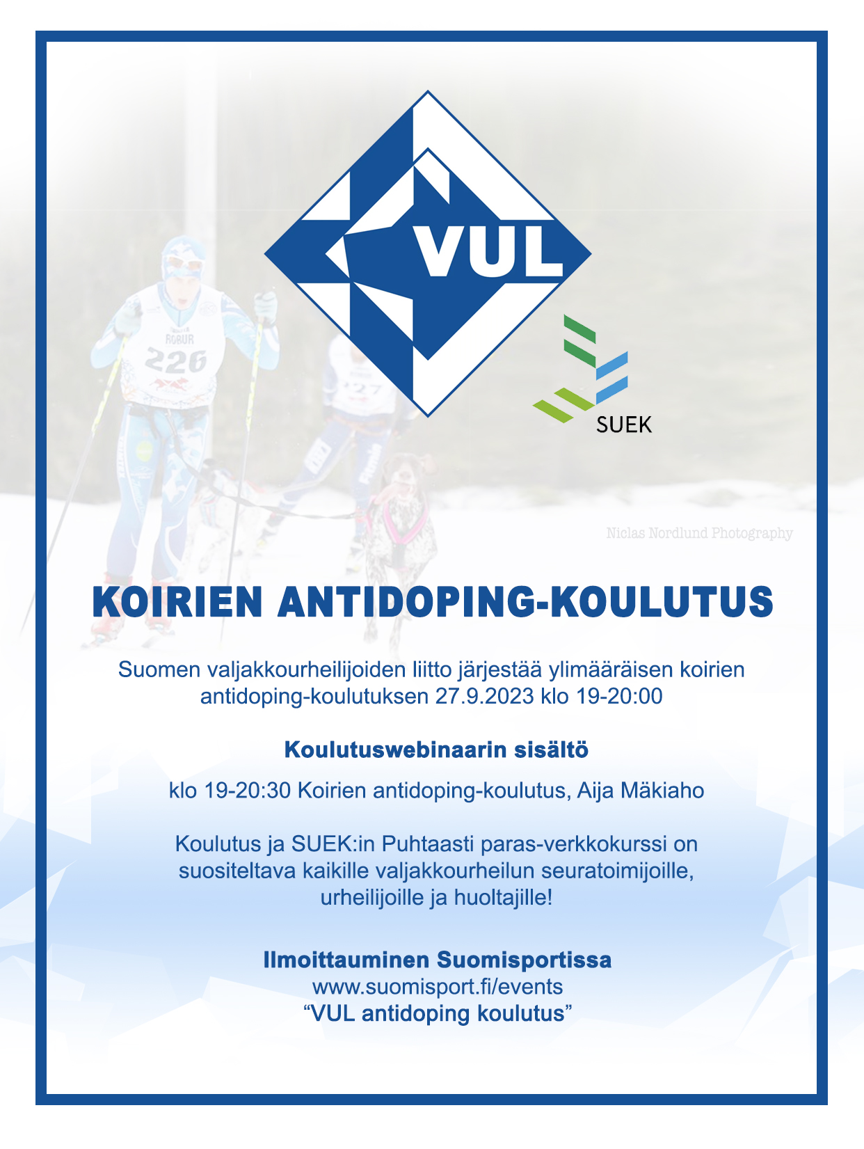 Koirien antidoping -koulutus järjestetään etäkoulutuksena Teamsin välityksellä 27.9.2023, klo 19 – 20.30.