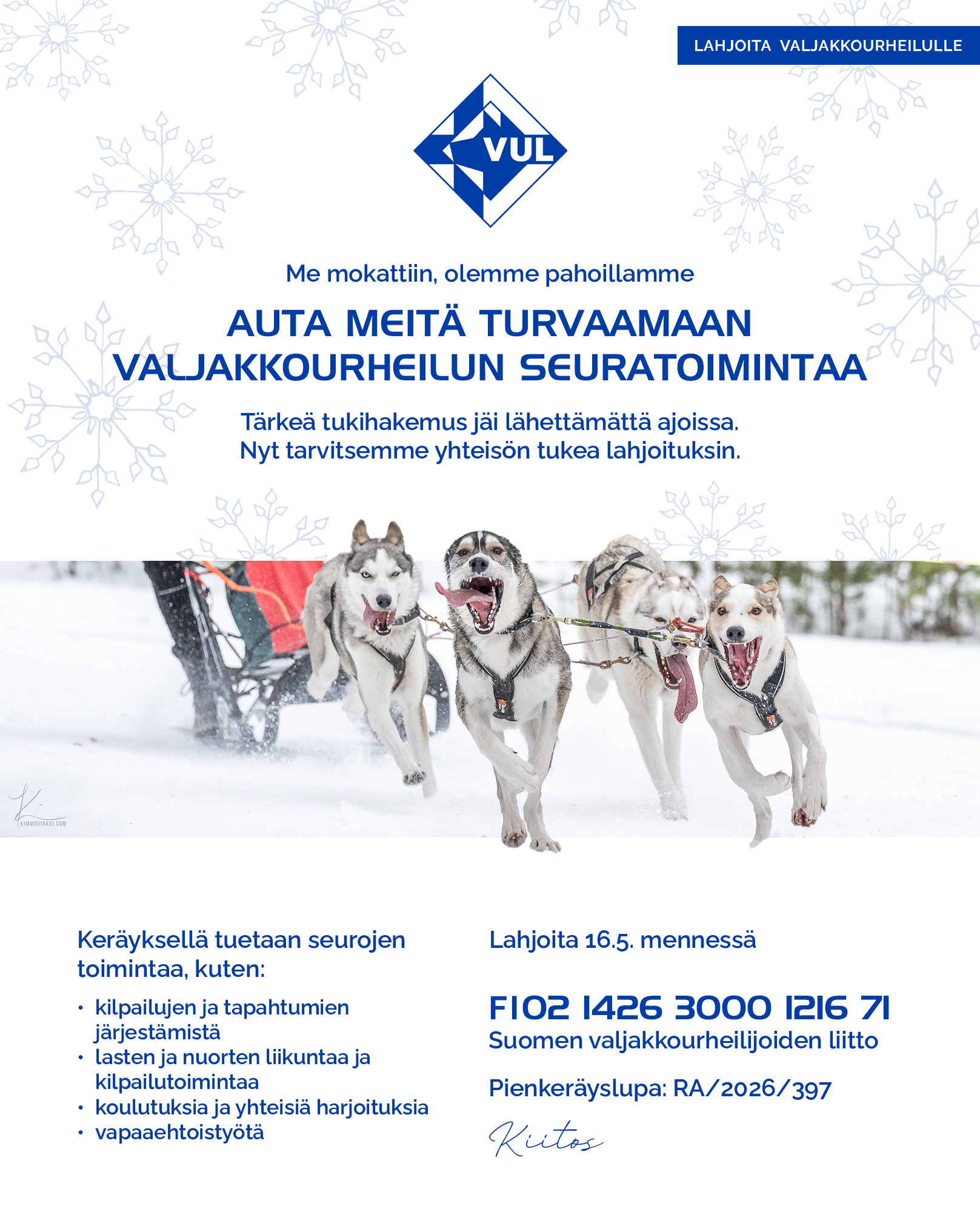 Pyydämme lahjoituksia liitolle, jotta voimme tukea seurojemme toimintaa ja pitää valjakkourheilun voimissaan.