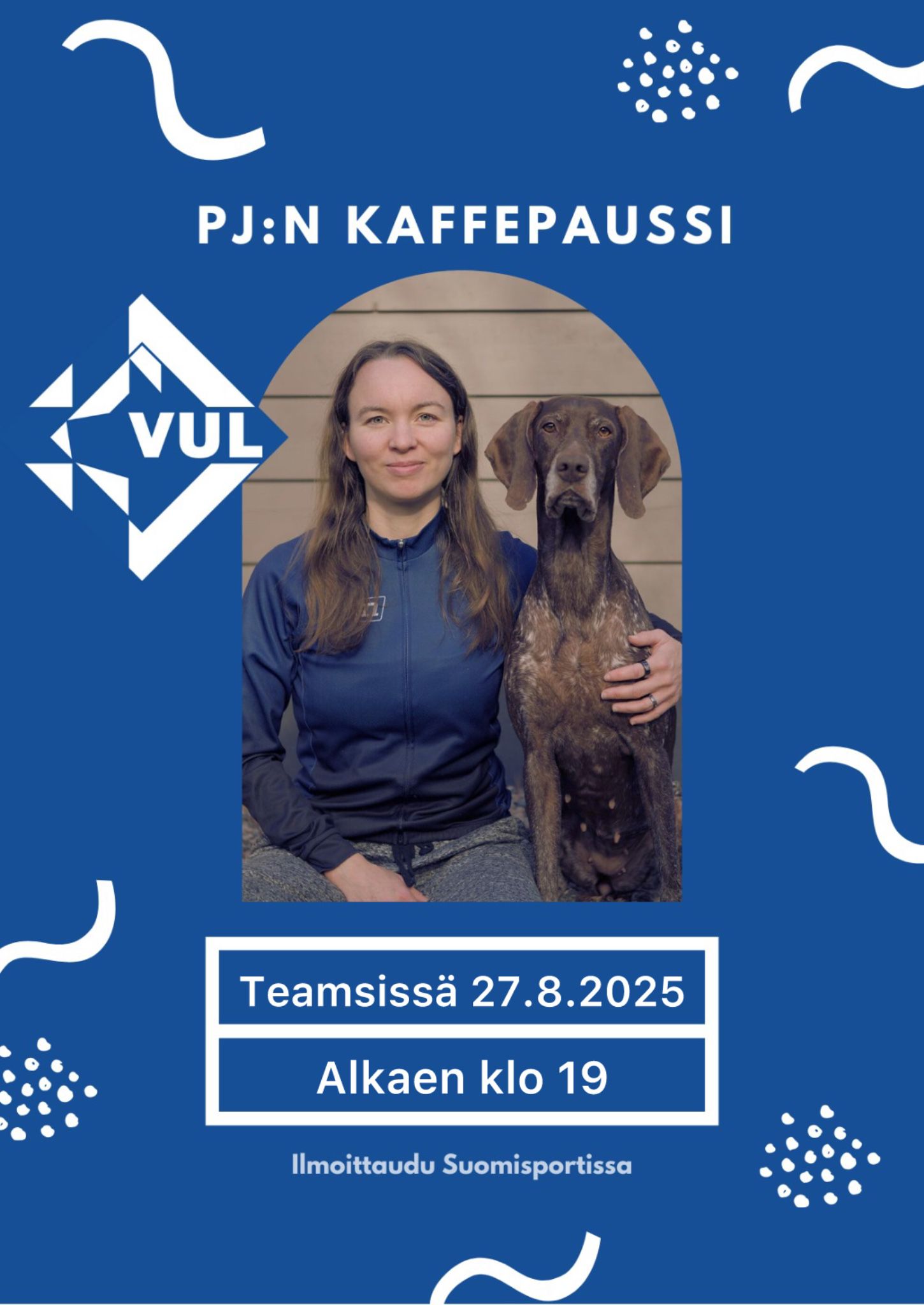 Aiheita PJ:n kaffepaussiin: SOC 2025, vaatetilauksen tarve / tulossa, talvelle ja keväälle voi hakea kilpailuja vielä (hakuaikaan mennessä haettujen kanssa ei päällekäin jos samoja / kilpailevia luokkia), lisenssit myyntiin 1.9., DID-lisenssit jos tarvii, Juokse koiran kanssa -päivä, KV-kisoja ei ole tulossa talvelle.
