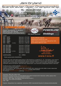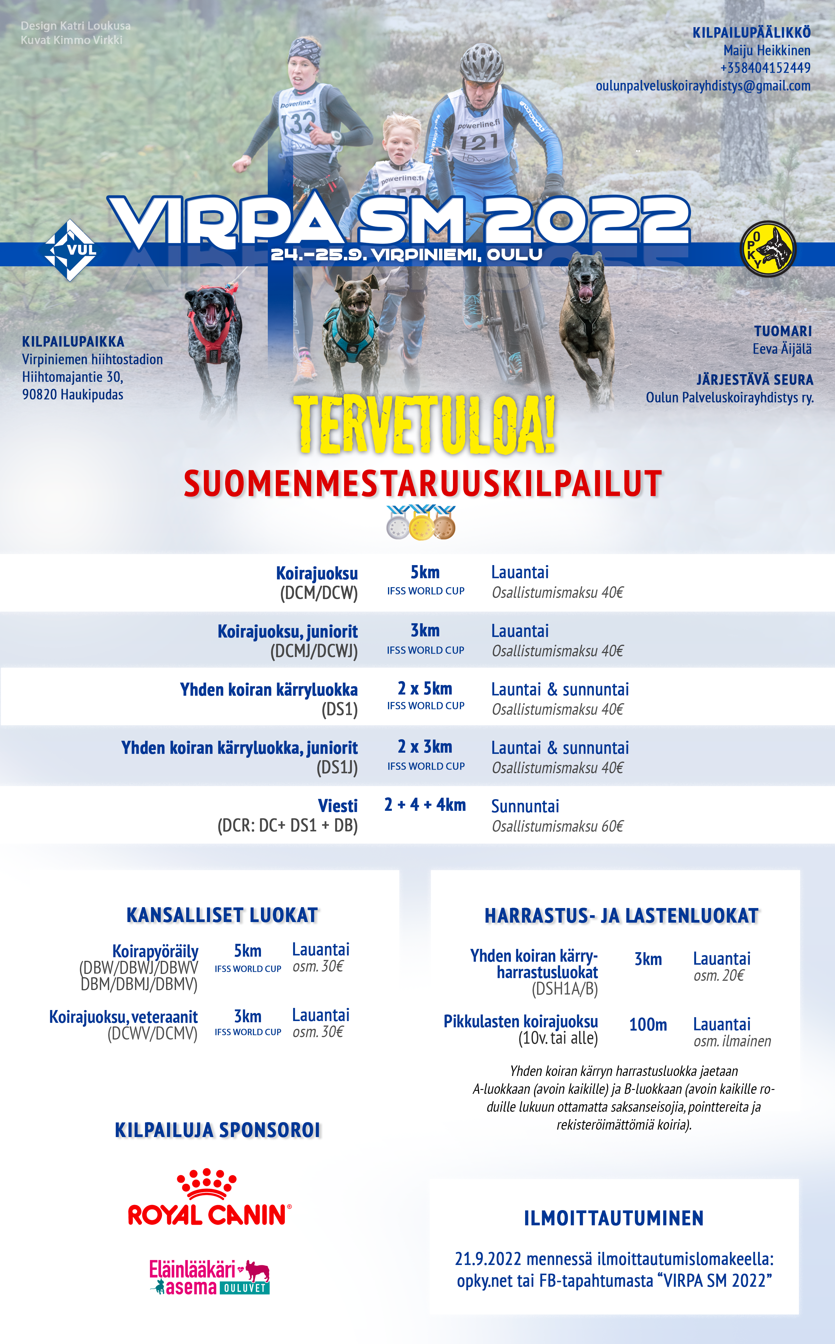 Syksyn 2022 sulanmaan SM-kilpailut käydään 24. – 25.9.2022 Oulun Virpiniemessä ja 15. – 16.10.2022 Jämijärvellä. Oulussa kilpaillaan yhden koiran kärryluokkien ja koirajuoksun sekä viestin SM ja Jämillä koirapyöräilyn ja isojen kärryluokkien SM. Jämillä järjestetään yhdessä SM-kilpailun kanssa myös sulanmaan lajien SOC-kilpailu eli avoin Pohjoismaiden mestaruuskilpailu.