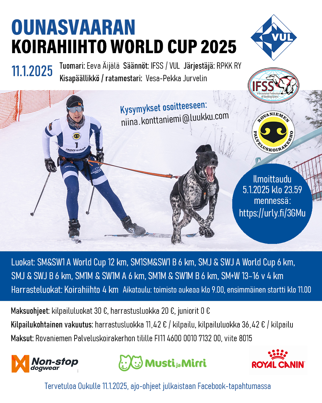 Maksuohjeet: kilpailuluokat 30 €, harrastusluokka 20 €, juniorit 0 €