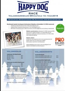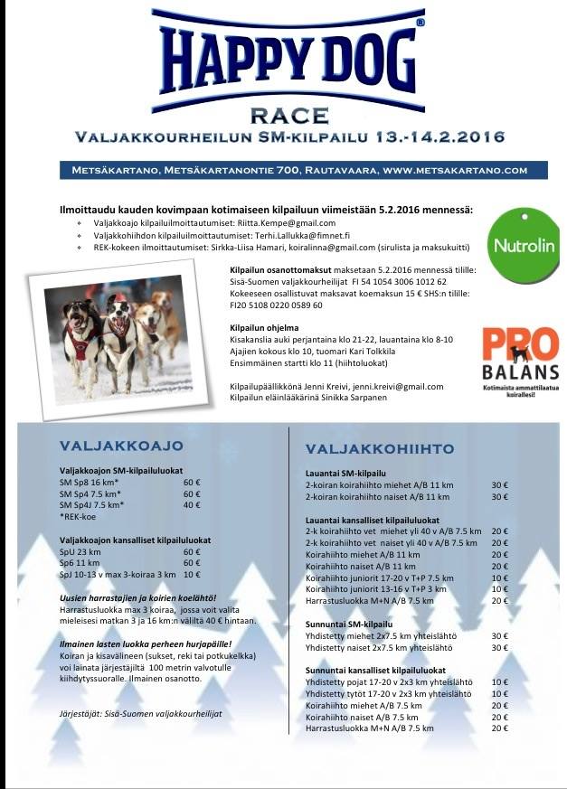 Sprinttiajon ja hiihtoluokkien SM-kilpailut, Happy Dog Race, järjestetään 13. – 14.2.2016, Rautavaaran Metsäkartanolla.