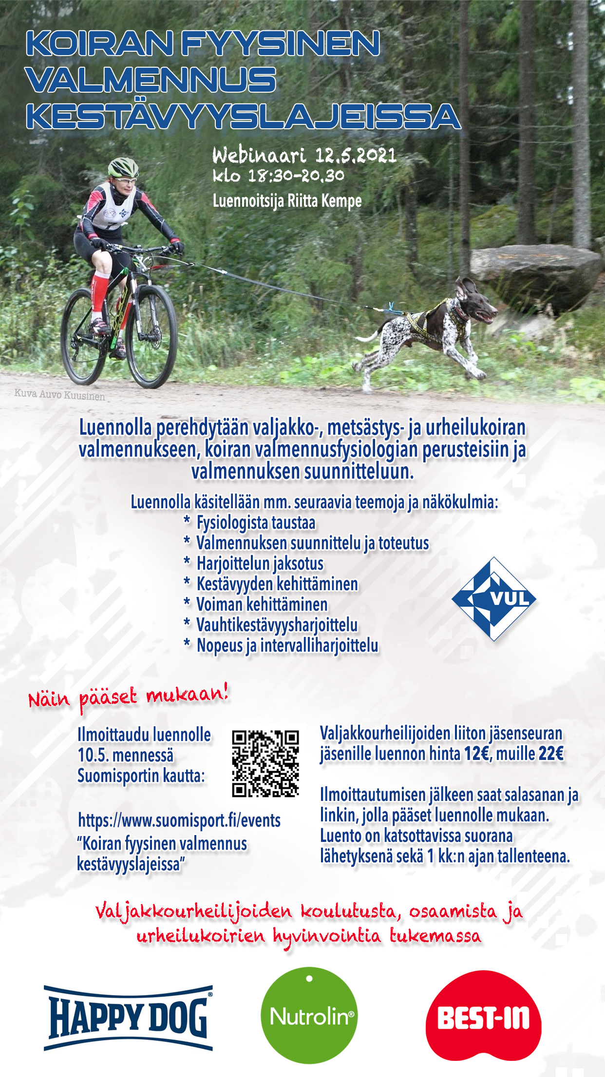 Valjakko- ja urheilukoiran fyysinen valmennus kestävyyslajeissa luento – Riitta Kempe Posted on 14.4.202114.4.2021 by Toimisto VUL järjestää yhdessä Sporttirakin kanssa Valjakko- ja urheilukoiran fyysinen valmennus kestävyyslajeissa -luennon 12.5.2021 ILMOITTAUTUMINEN JA LISÄTIEDOT LÖYTYVÄT TÄÄLTÄ
