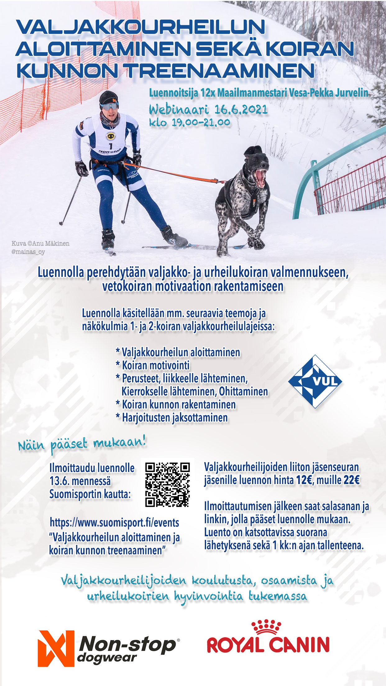 Valjakkourheilun aloittaminen sekä koiran kunnon treenaaminen luento – Vesa-Pekka Jurvelin Posted on 7.5.2021 by Toimisto VUL järjestää yhdessä Sporttirakin kanssa Valjakkourheilun aloittaminen sekä koiran kunnon treenaaminen -luennon 16.6.2021